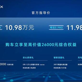 【售10.98万元起,极狐考拉S上市】今日,北汽极狐考拉S正式上市。新车两款配置,官方指导价10.98-11.98万元。作为年轻人第一辆纯电SUV的新选择,极狐考拉S拥有2820mm大轴距,全系配备电动侧滑门,驾乘舒适性得到提升。而在动力方面,该车全系标配宁德时代电池,其续航均为500km(CLTC),快充模式下从30%-80%,仅需26分钟。